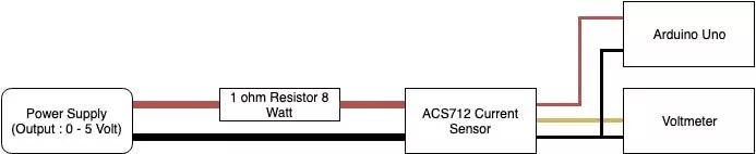 对于此项目,我们使用电源(输出电压为0至5伏)和一个1欧姆的额定功率8瓦电阻器来产生0至5安培的电流。稍后,我们将测量ACS712电流传感器的电压输出。