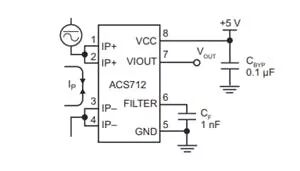 霍尔效应传感器是换能器类型的组件,可以将磁信号转换为电信号以进行后续的电子电路处理。通常,电流传感器使用霍尔效应将电流输入转换为电压输出。在霍尔效应中,来自电流的电子流过磁场板。然后,该场使电子“推”到板的一侧,并在两侧之间产生电压差。来自板侧的电压差是传感器的输出。 ACS712是可以同时在AC和DC上运行的电流传感器。该传感器工作电压5V,并产生与测量电流成比例的模拟电压输出。该工具由一系列带有铜线的精密霍尔传感器组成。 当电流通过铜初级传导路径(从引脚1和2到引脚3和4)增加时,该仪器的输出具有正斜率。传导路径的内部电阻为1.2mΩ。