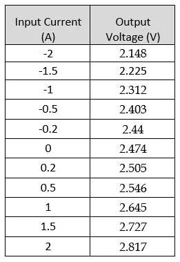 我们通过在-2A至2A输入范围内给出12个测量点来测试传感器。每个相应测量的电压读数为: